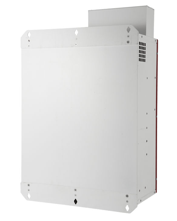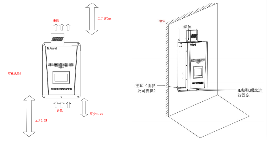 壁掛模塊安裝時,模塊從下方進風,向上排風。熱量從下往上散發,模塊上下出口至少要預留150mm的進出風空間且安裝位置與地面的距離要在1.5米以上,禁遮擋出風口。壁掛式模塊通常安裝在墻壁上或者尺寸較小的柜體內,標準配置一對掛耳,如圖所示。可在墻壁打10的孔,用M8的膨脹螺絲進行固定。壁掛式模塊會配備7.0寸彩色觸摸屏。